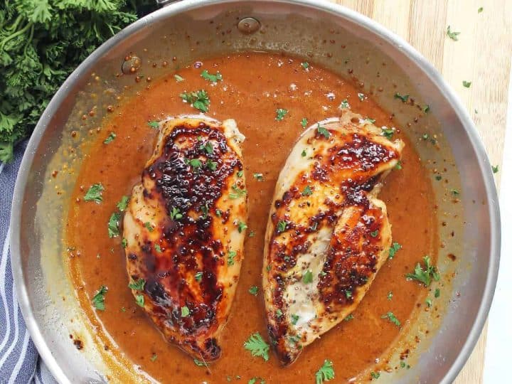 Honey and mustard are a classic flavor combination. The marinated chicken is cooked in a skillet for a quick and easy dinner.
