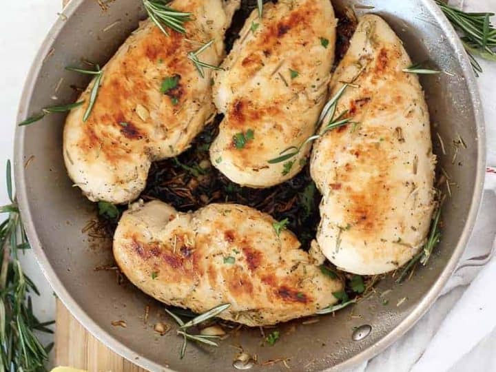 Chicken breasts are marinated in a lemon and rosemary sauce before being cooked in a skillet on the stovetop.