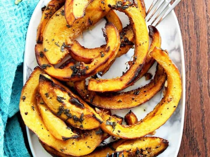 Pumpkin slices are roasted with garlic and sage butter for a delicious and indulgent thanksgiving veggie side. Easy to make with little effort needed!