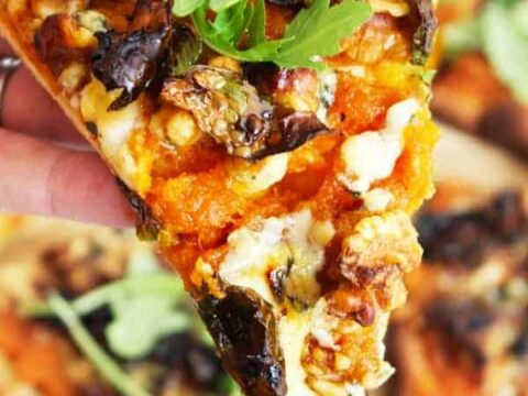 This pumpkin pizza is the perfect savory fall treat! Quick and easy to make, it's topped with blue cheese and loaded with tasty and crunchy toppings like walnuts and roasted sprout leaves. This pizza packs a flavour punch!