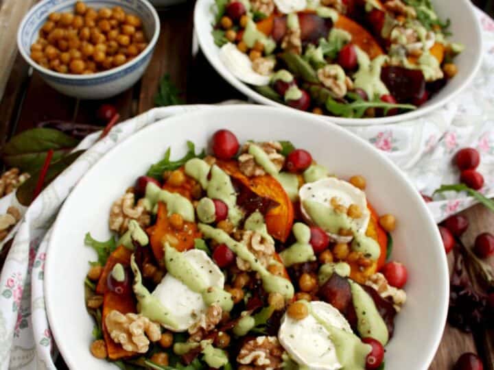 Colorful and healthy Warm Winter Salad with Pumpkin, Goat Cheese, Cranberries and Avocado Dressing. Comforting, delicious and easy holiday meal ready in 30 minutes!