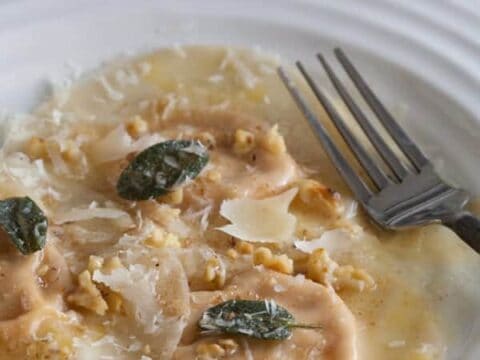 Pumpkin ravioli with brown butter and sage is a delicious vegetarian dinner that uses the season’s favorite squash, pumpkin! Add toasted walnuts for extra flavor!