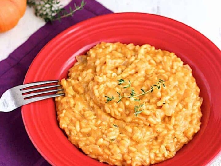 This pumpkin risotto is creamy, savory, and delicious. Though this risotto is undeniably a savory dish, the slight sweetness of the pumpkin still shines through.