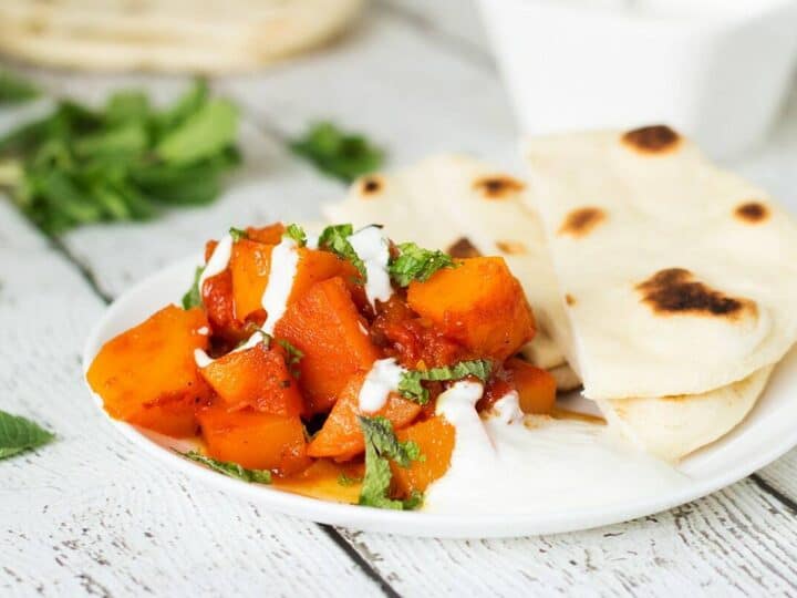Afghan Sauteed Pumpkin (Kadu Bouranee) is one of the most known dishes outside the country. Pumpkin or butternut squash is cooked in spices and served with the amazing yogurt garlic sauce. So good and so easy to make!
