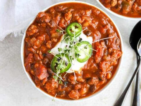 Easy Pumpkin Chili takes your traditional turkey and bean chili and gives it a nutritious upgrade by adding canned pumpkin puree. Done in about an hour, this pumpkin turkey chili is protein packed, healthy, and great for leftovers (or to feed a crowd!).
