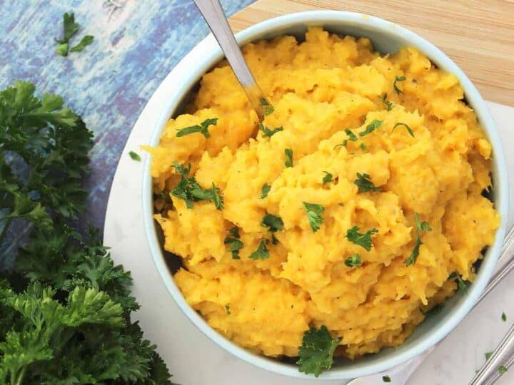 Easy and quick to make roasted pumpkin mash is a sweet and salty side dish perfect for fall. Seasoned with cinnamon and ready to serve in less than 30 minutes.