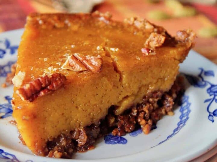 Pecan Crusted Caramel Pumpkin Pie is a gluten-free, rustic and over-the-top delicious Thanksgiving and holiday dessert. The crust is a treat in and of itself and the caramel notes in the filling will make you swoon!