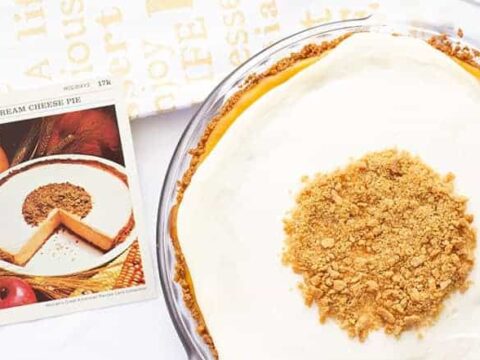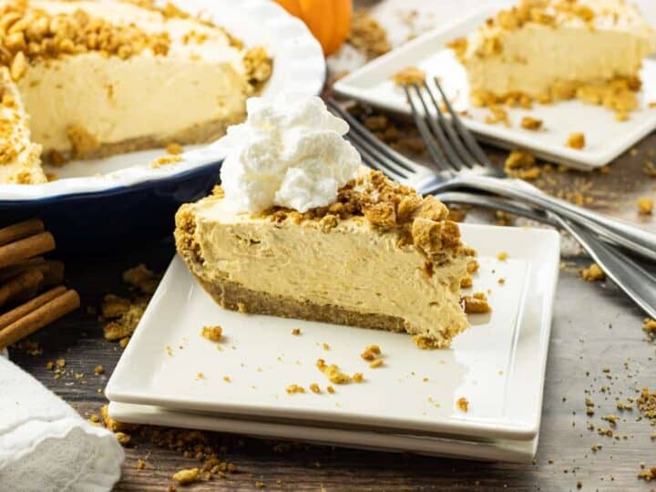 This No Bake Pumpkin Pie is made with a graham cracker crust filled with a creamy pumpkin pie filling topped with a crunchy brown sugar, graham cracker topping.